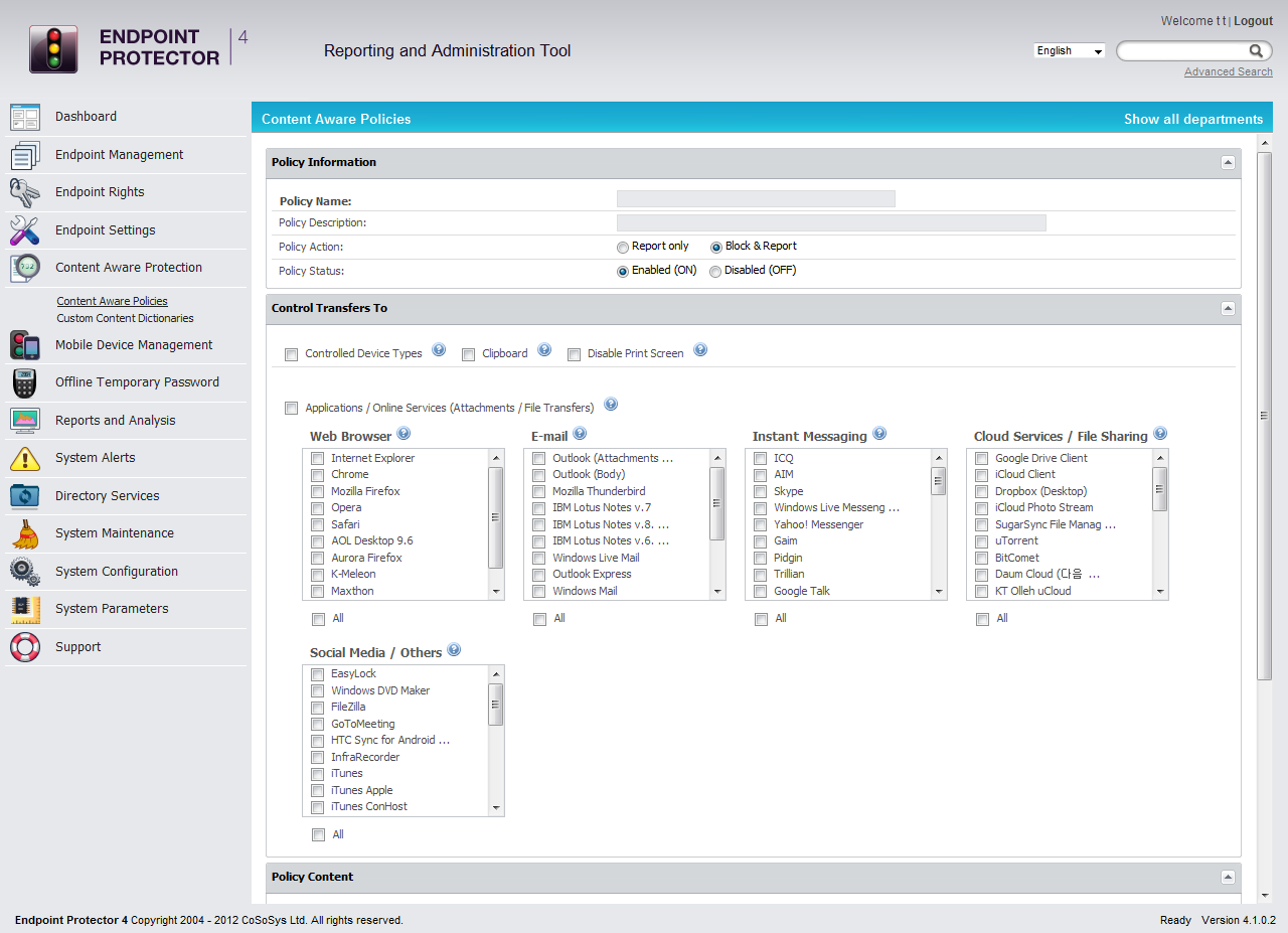 Verhindern Sie Datenlecks, die bei der Verwendung von verbreiteten Applikationen, Cloud- und Web-Diensten wie Dropbox, Web-Browser, Webmail und E-Mail Clients entstehen. - Schützen Sie vordefinierte Inhalte wie Kreditkartendaten